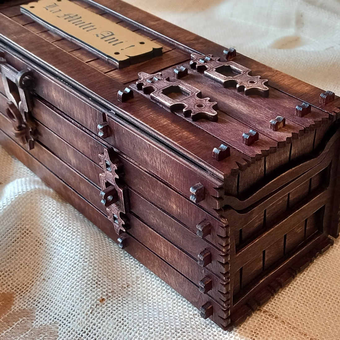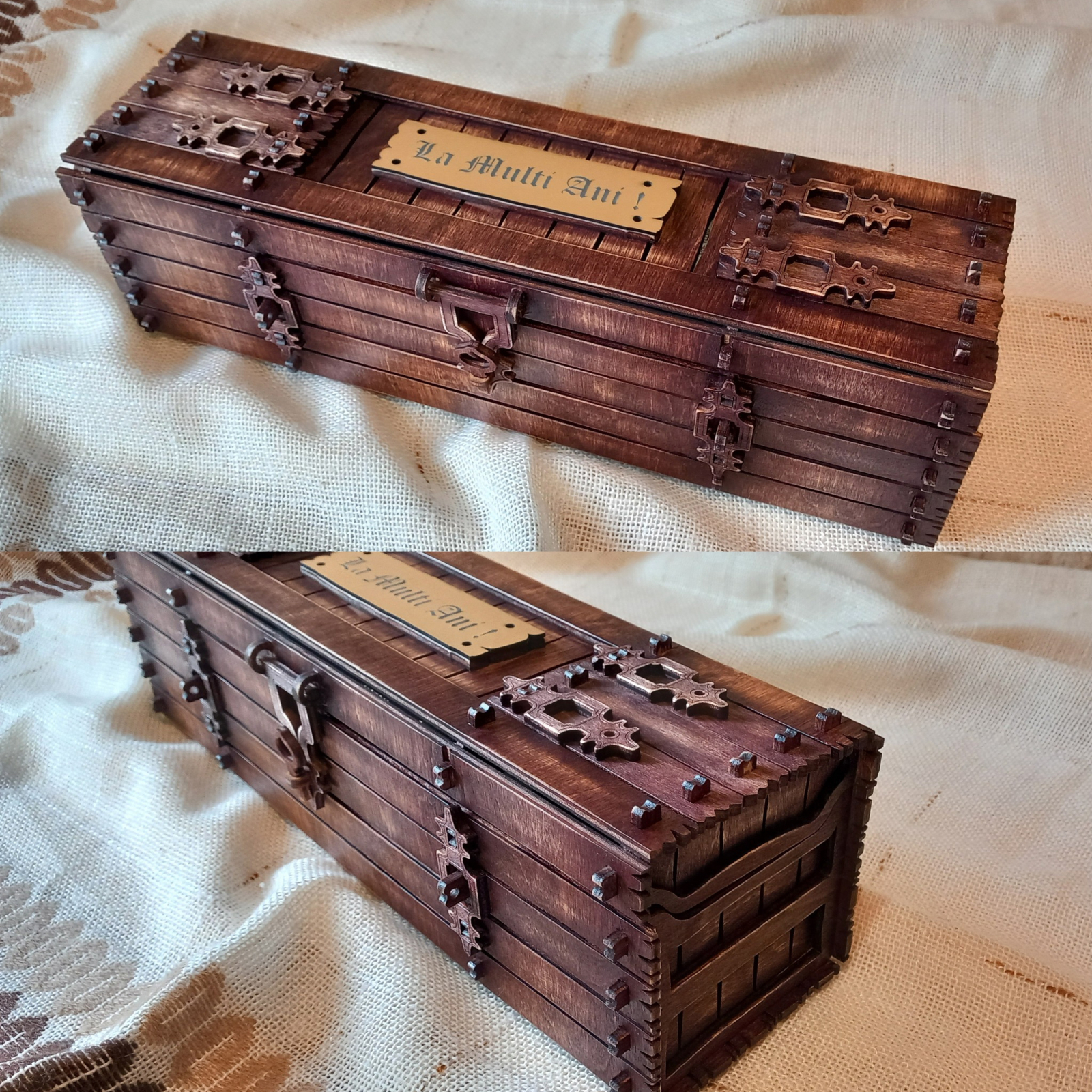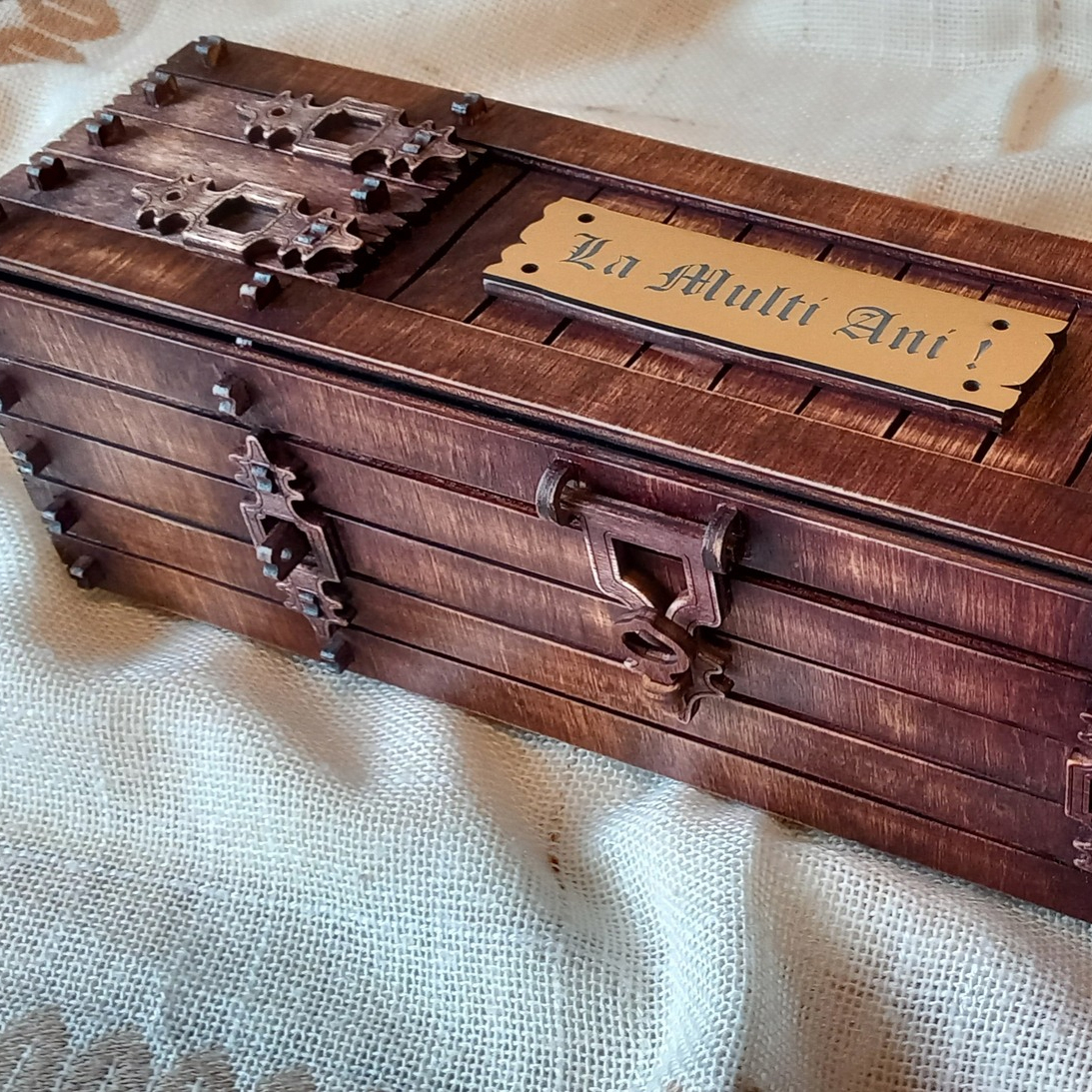 Cutie din lemn realizată manual, cu un finisaj antichizat deosebit și detalii decorative atent lucrate, concepută pentru a transforma o sticlă de vin într-un cadou cu adevărat impresionant. Designul robust, inspirat din stilul clasic, este completat de elemente decorative tip feronerie și un sistem de închidere elegant, care oferă atât siguranță, cât și un aer nobil.