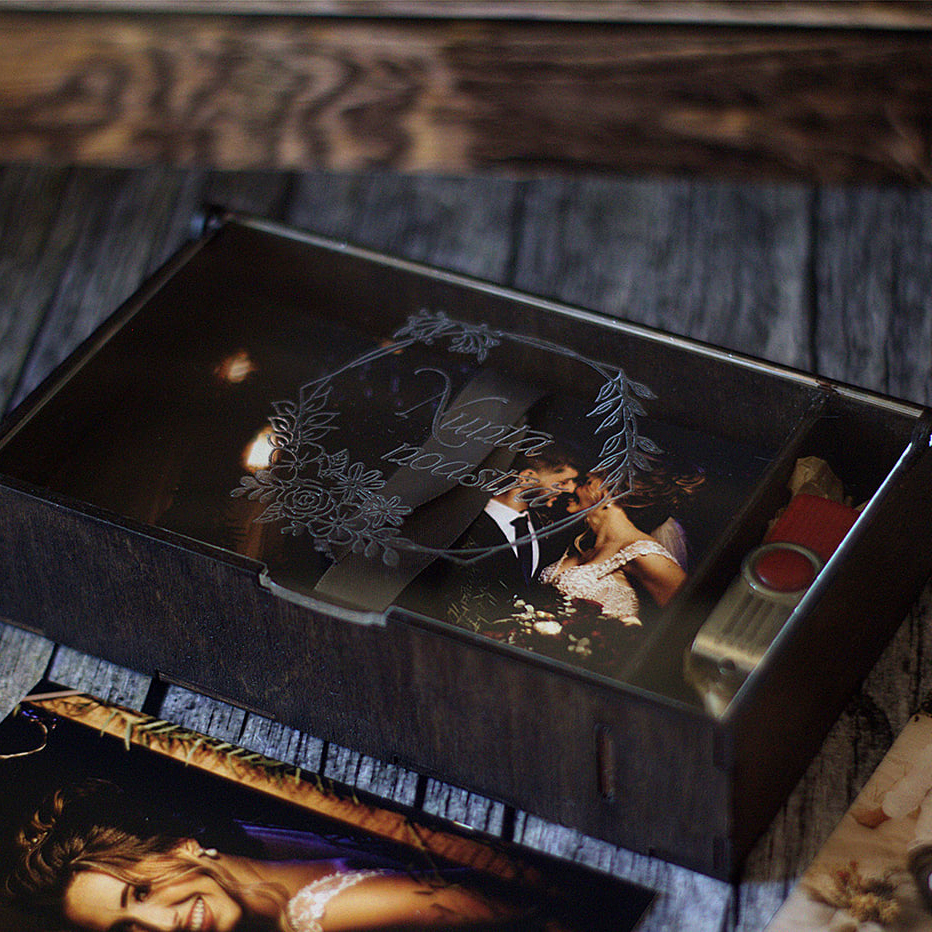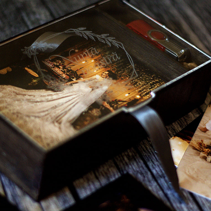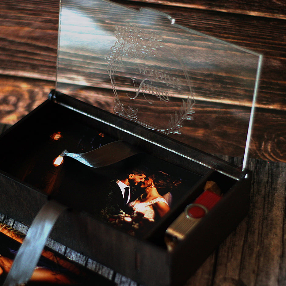 Cutie din lemn natural, cu capac din plexiglas transparent, fin gravat, creată pentru a pune în valoare amintirile speciale. Construcția este gândită special pentru fotografii în format 10×13 cm și un stick USB, oferind un spațiu sigur și elegant pentru păstrarea atât a fotografiilor tipărite, cât și a fișierelor digitale.