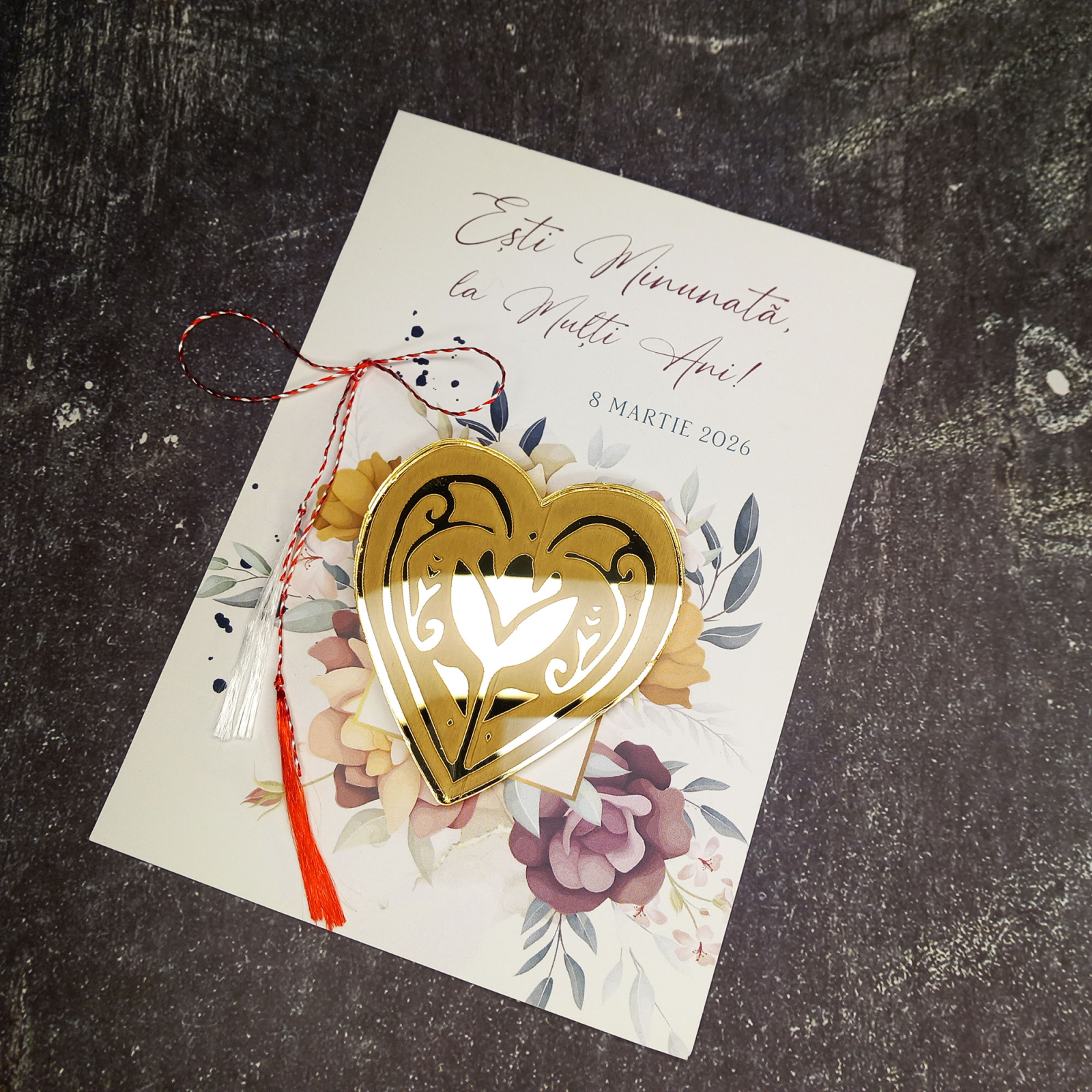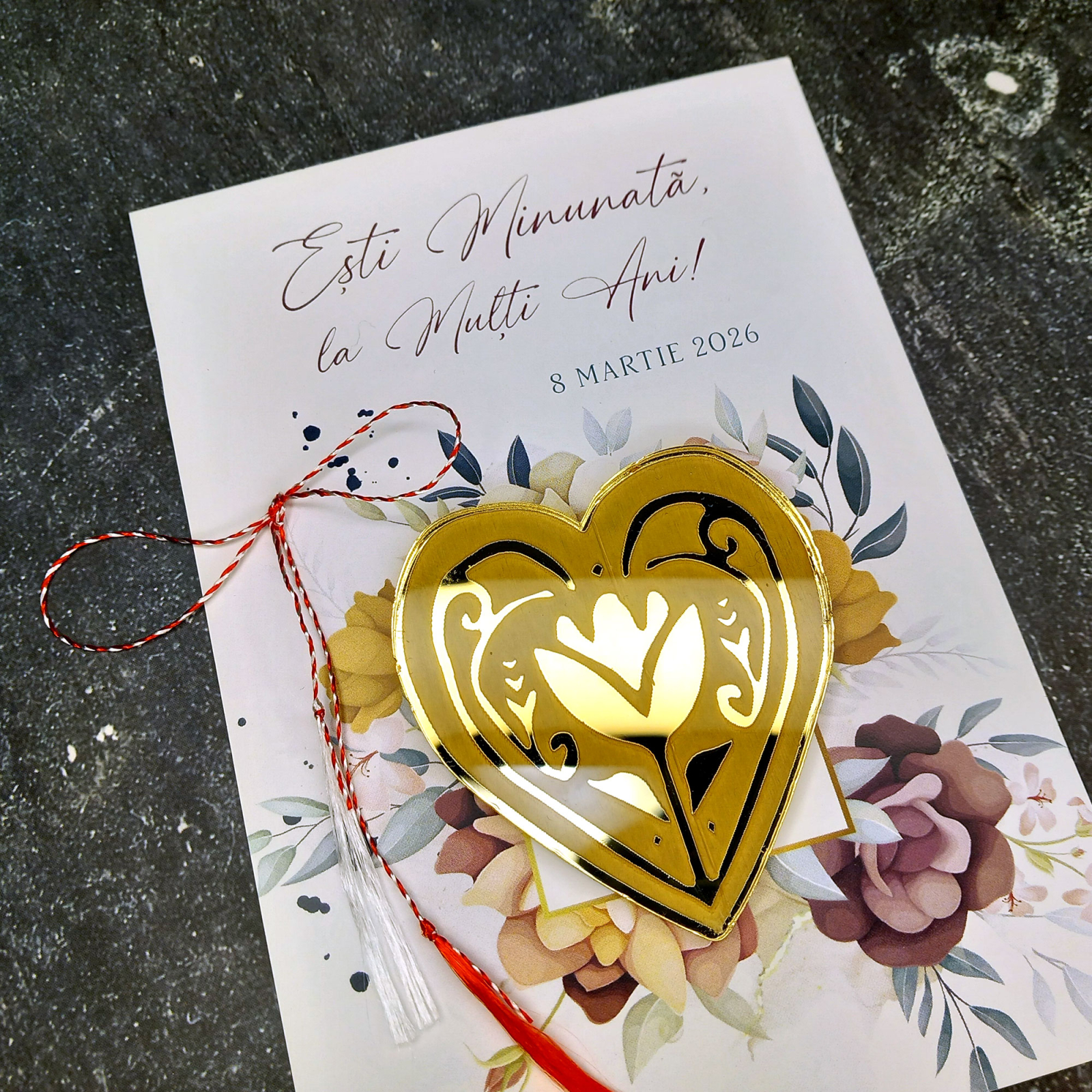 Această felicitare de 1–8 Martie îmbină eleganța designului floral cu strălucirea unei decorațiuni din plexiglas oglindă auriu, sub forma unei inimi stilizate, aplicată manual pe carton.